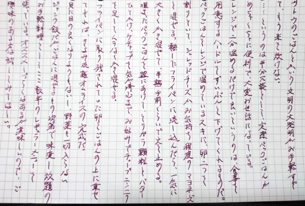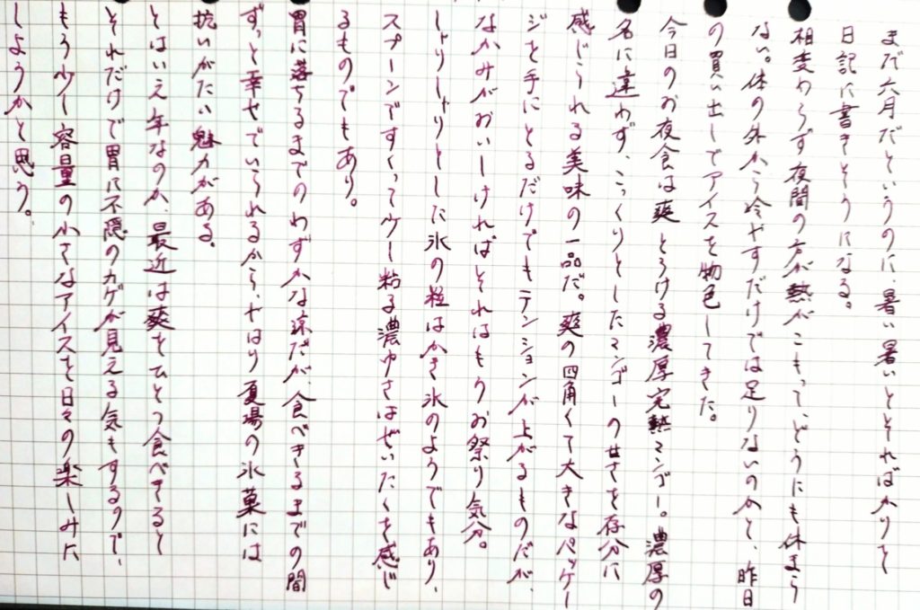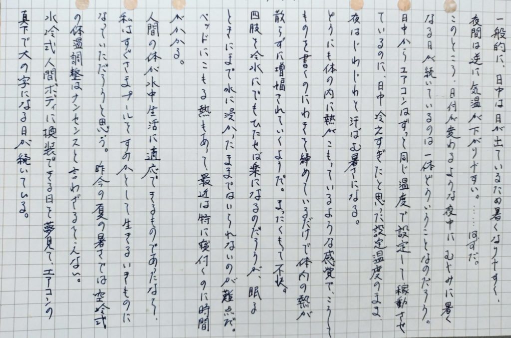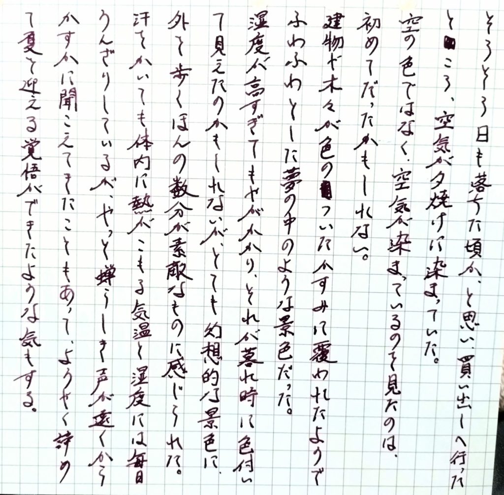 今日は何を書こうか、と袋から出してしばらく眺めていた紙の片端がたわみだしたのを見て、ついに触れずに湿気を与えてしまったか……? と思ったものの、エアコンを除湿で動かしていてもなお湿っぽい部屋の空気のせいということは明白だった。