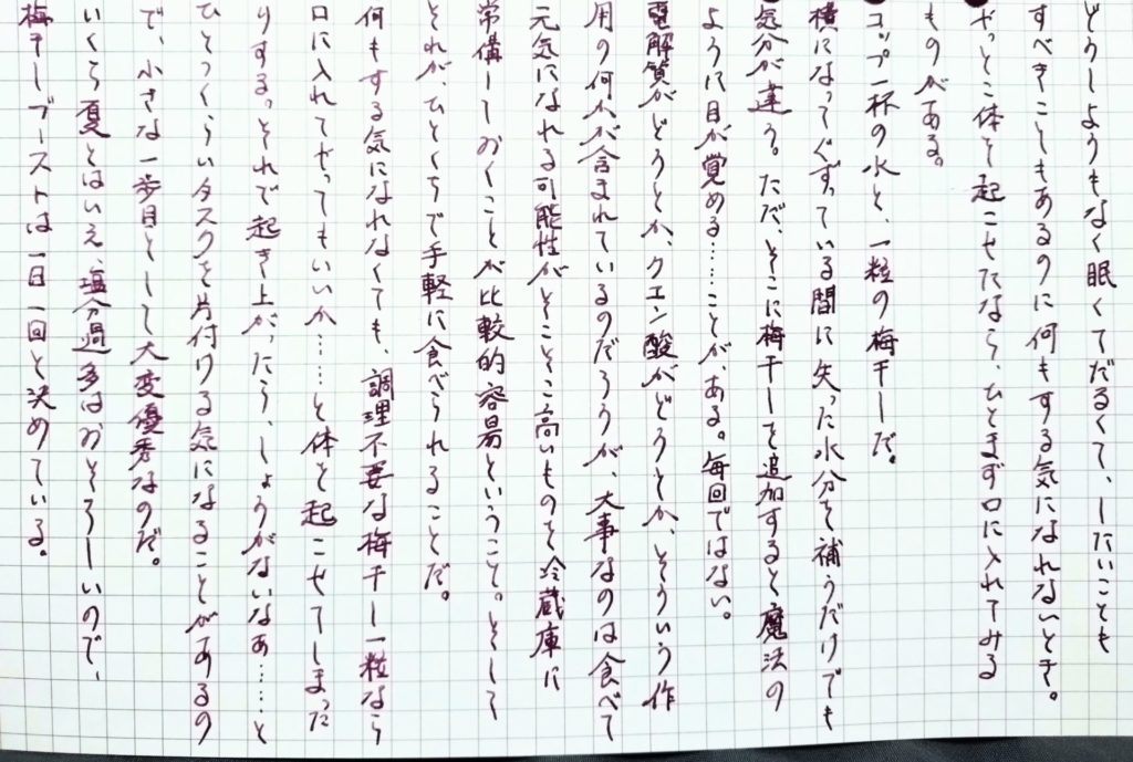 いくら夏とはいえ、塩分過多はおそろしいので、梅干しブーストは一日一回と決めている。