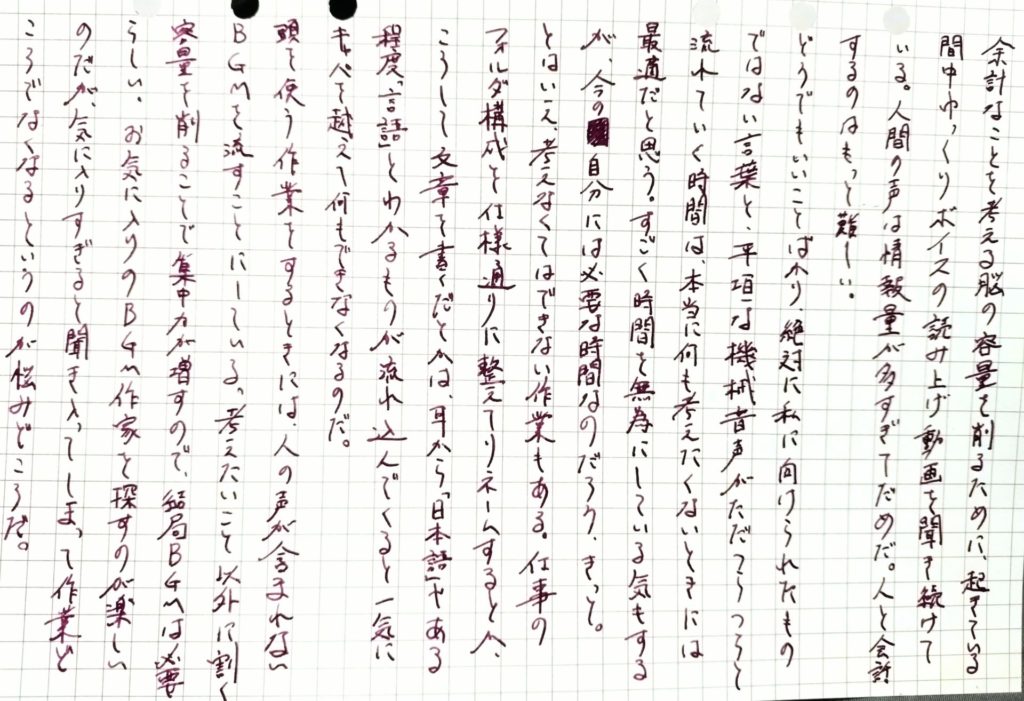 とはいえ、考えなくてはできない作業もある。仕事のフォルダ構成を仕様通りに整えてリネームするとか、こうして文章を書くだとかは、耳から「日本語」やある程度「言語」とわかるものが流れ込んでくると一気にキャパを超えて何もできなくなるのだ。