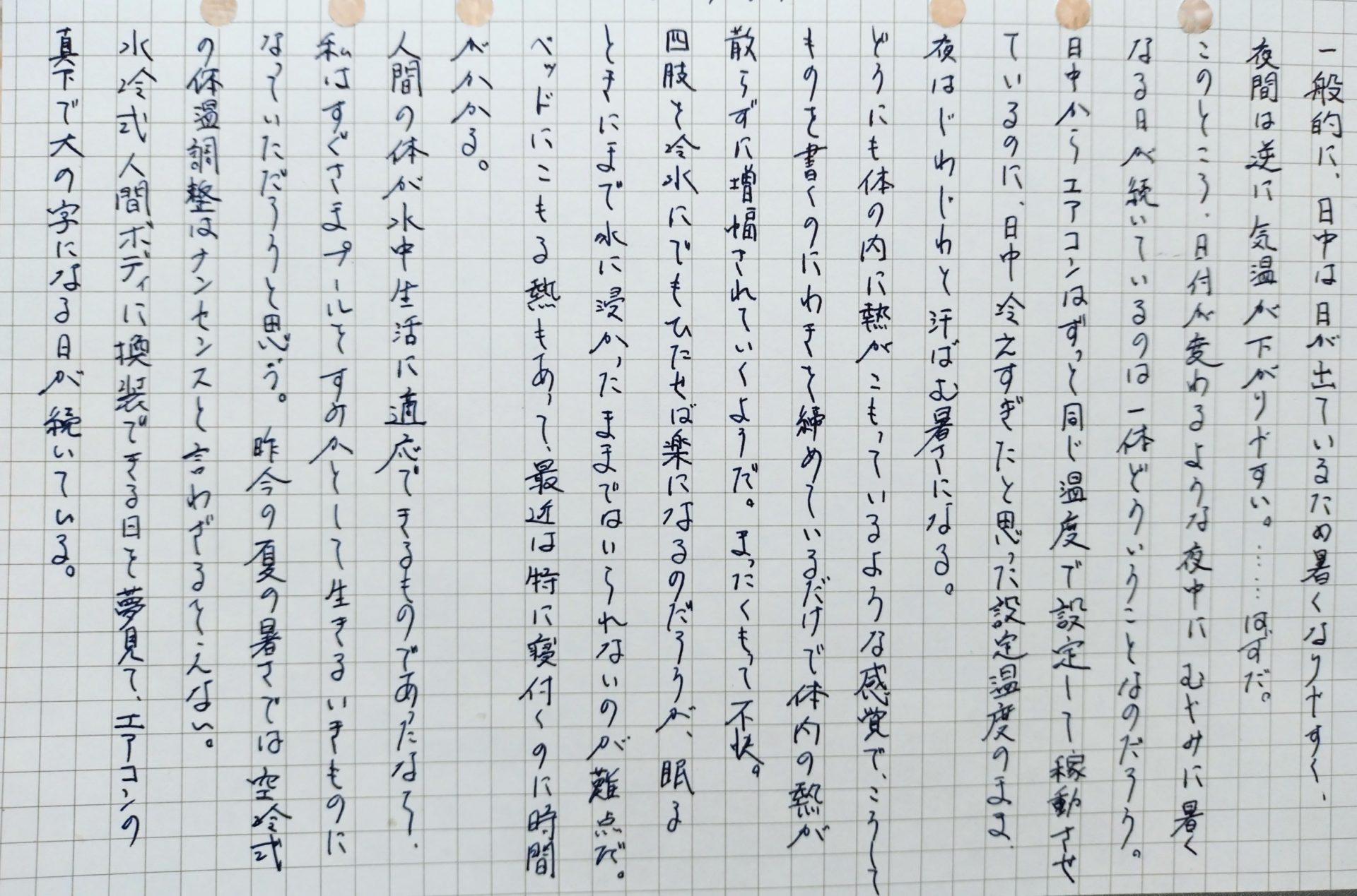 四肢を冷水にでも浸せば楽になるのだろうが、眠るときにまで水に浸かったままではいられないのが難点だ。ベッドにこもる熱もあって、最近は寝付くのに時間がかかる。