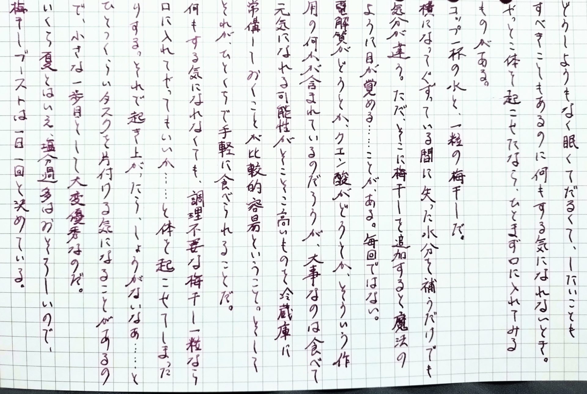 横になってぐずっている間に失った水分を補うだけで気分が違う。ただ、そこに梅干しを追加すると魔法のように目が覚める……ことが、ある。毎回ではない。