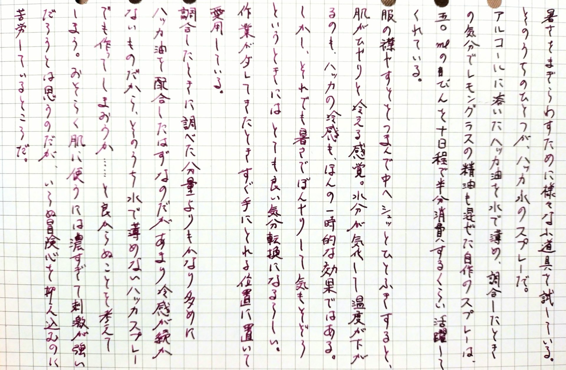 アルコールに溶いたハッカ油を水で薄め、調合したときの気分でレモングラスの精油を混ぜた自作のスプレーは、五〇mlのびんを十日程で半分消費するくらい活躍してくれている。