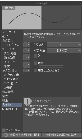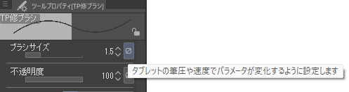 最後に重要なのがこれ。筆圧感知をオフにします。これが残っていると、さっき入り抜きを切ったのにまだ線の端がとぎれとぎれになったりするので、「筆圧」のチェックを外します。