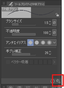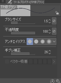 ツールプロパティでひとまずアンチエイリアスをオフにします。手ブレ補正はお好みでいいと思います。わたくしは普段から手ブレ補正に頼りまくっているというか、元にしたGペンも割と使うのでそっちの設定を引き継いだ数字になっています。