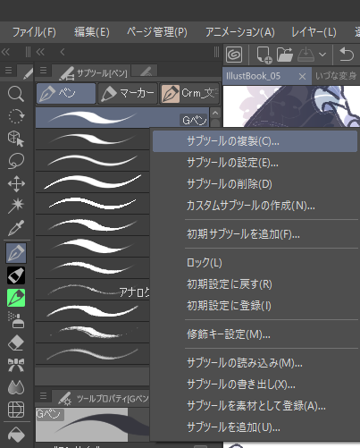 まずはクリスタ標準のペンツールからGペンを複製します。