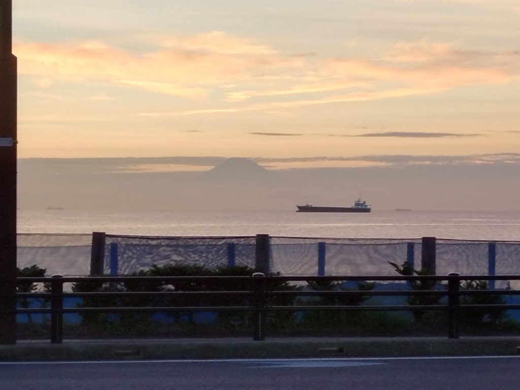 夕暮れに富士山の頭だけ見えていて、大きな船が通っていたり、いい時間帯でした。