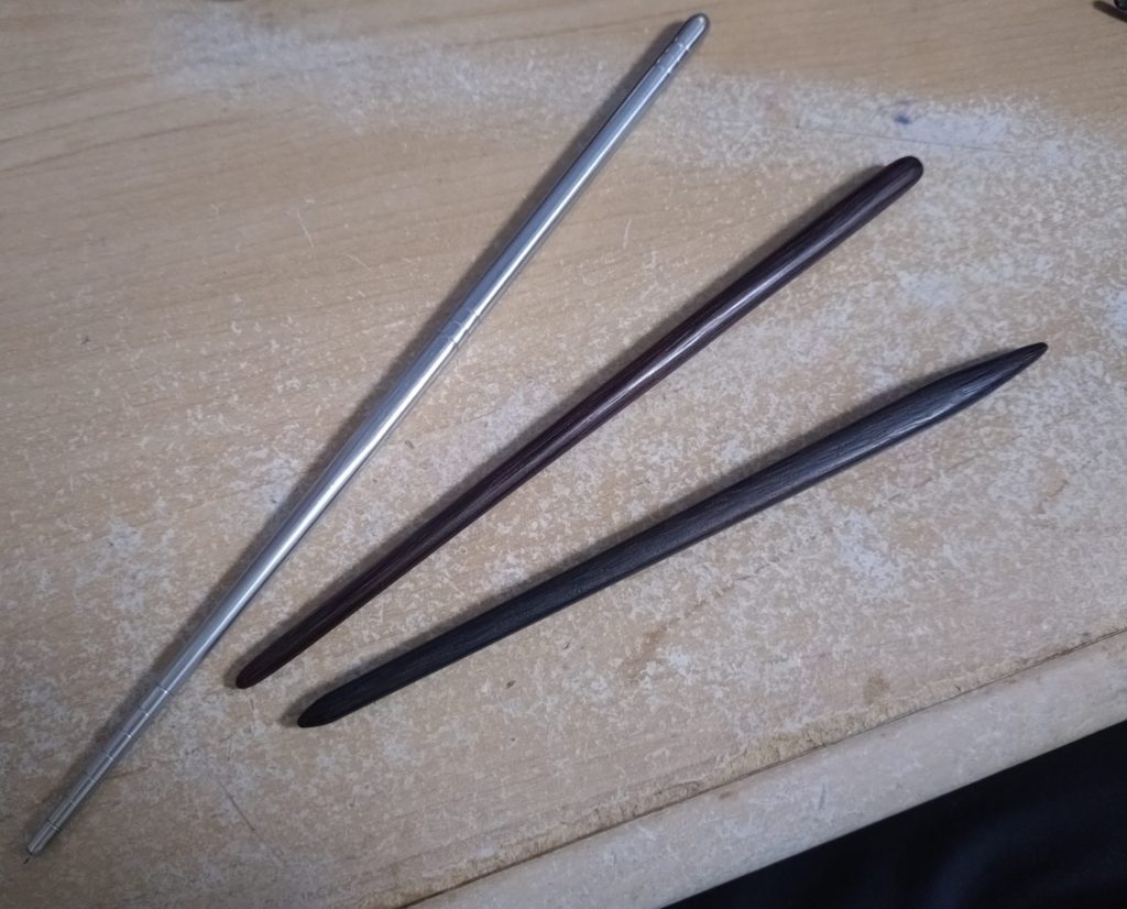 こげ茶色のは木製の箸をサンドペーパーで削って簪にしました。