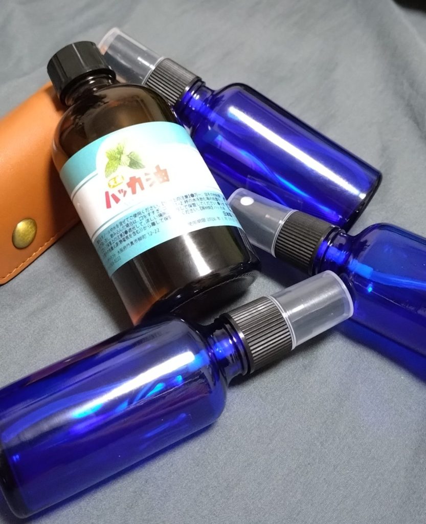 無水エタノールは在庫があるので、ハッカ油と作ったのを入れておくためのガラスのスプレーボトル。調合やらは明日やってみようと思います。