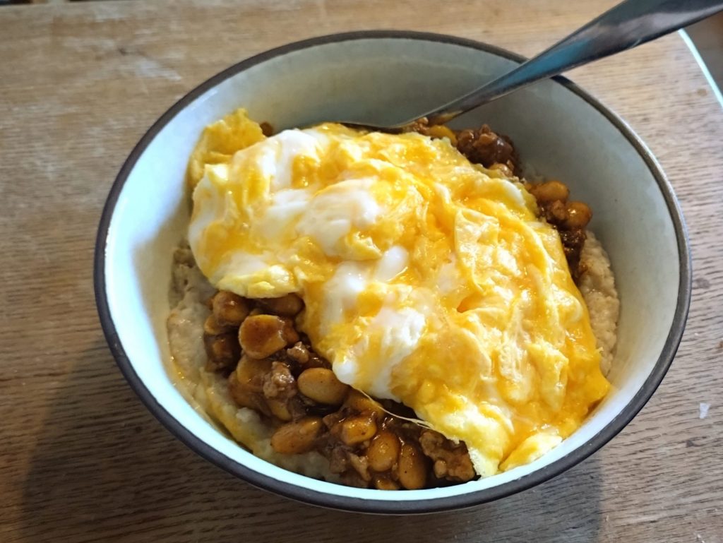 オートミールとカレーの上に、バターの香りのふわとろオムレツです。溶けるチーズを入れたらもっと完璧だったな……。