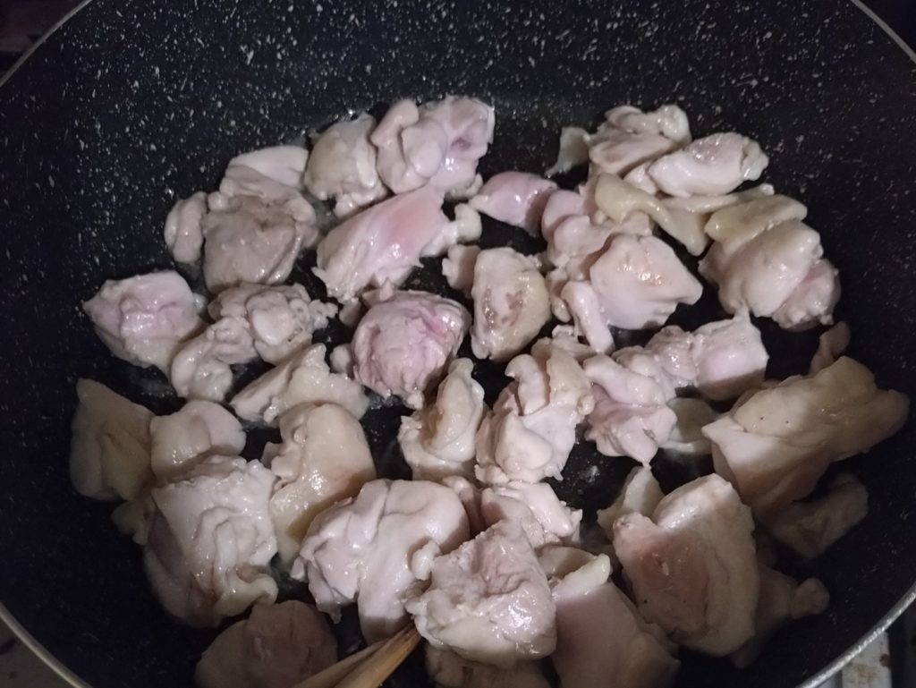 まずは鶏ももを一口サイズにカットして火を通します。