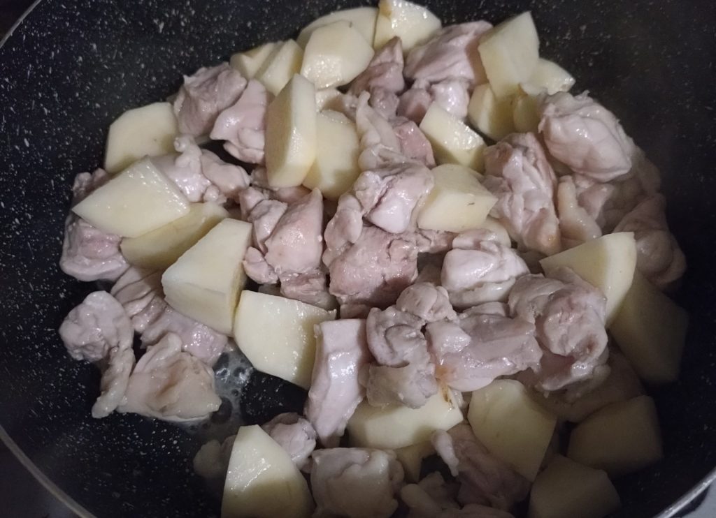 ある程度肉に火が通ったら、一口サイズにカットしたじゃがいもを入れます。