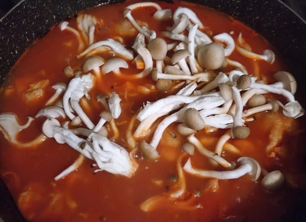 芋に火が通ったあたりでしめじをほぐして投入します。