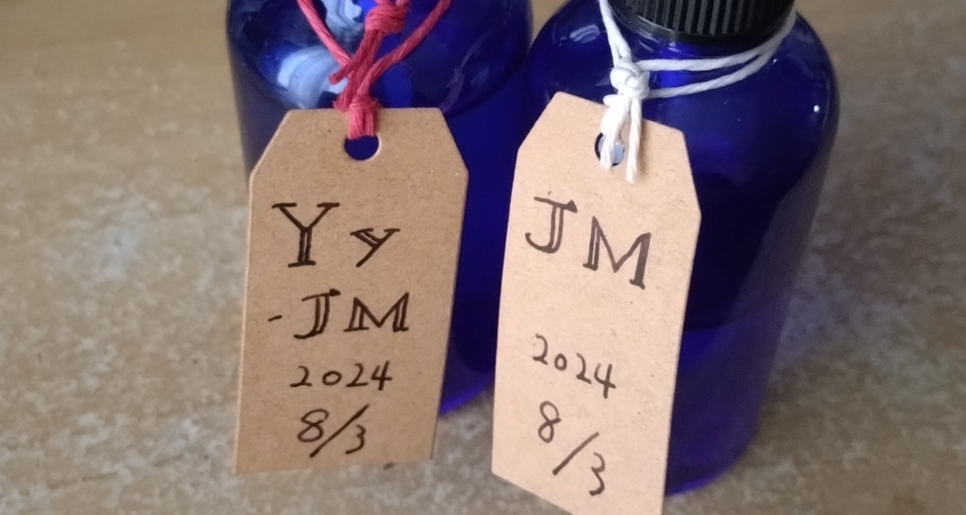 入れた香料の頭文字をとって、それっぽくしてみただけですが、見た目がすっきりして結構よろしいのでは。まんま香料の名前書いてあるだけより、暗号めいていて気分が上がります。