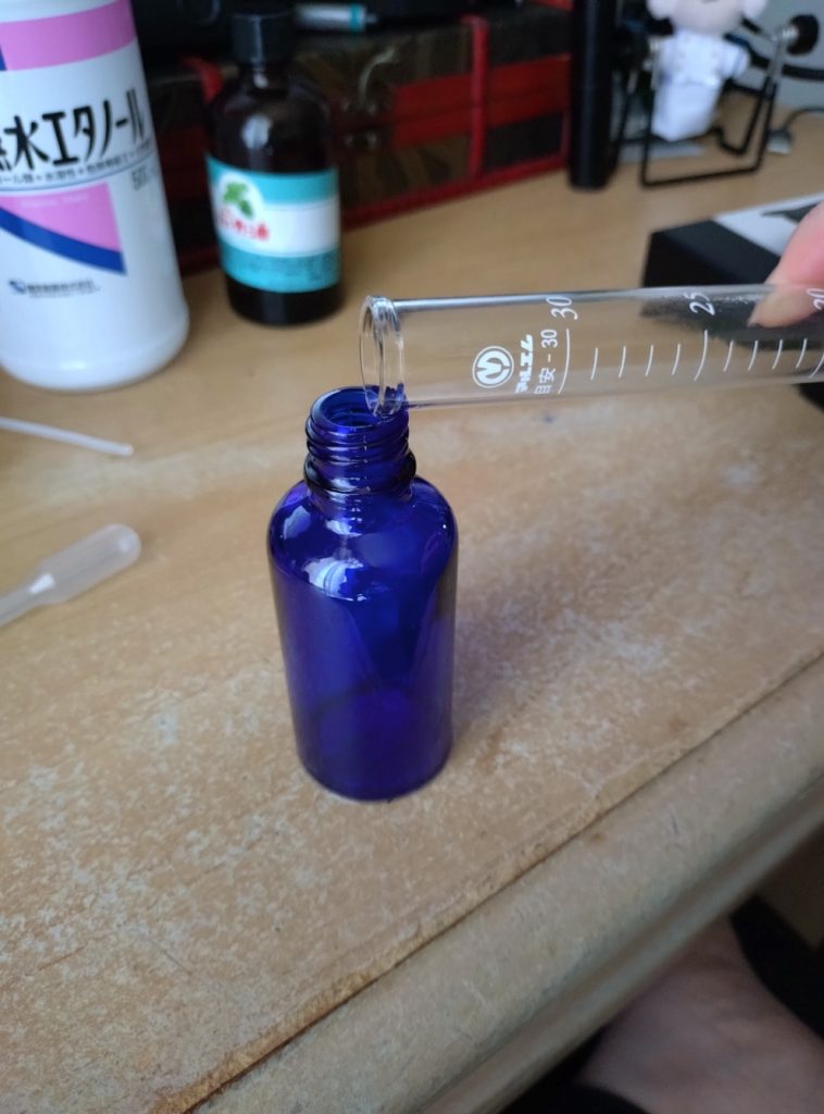 ハッカ油とエタノールが混ざったら、今回使用する遮光瓶に移します。