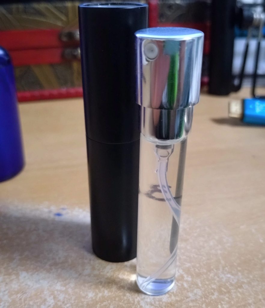 容量10mlで、瓶を入れている黒い筒をひねるとスプレー口が出てくるタイプです。