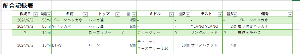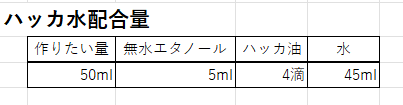 香水を作るにしても、二度と計算しなくていいように表を作りました。