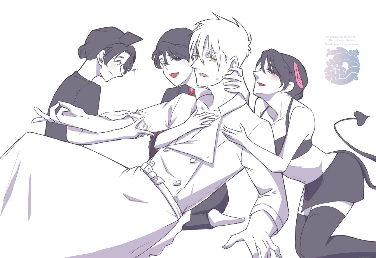 吸血鬼に、マッドなナースに、サキュバス……と好き放題青海に着せて遊んだので、本当にその種族として生活している世界と混線してしまったIFでイワンさんにまとわりつく青海たちを描きました。