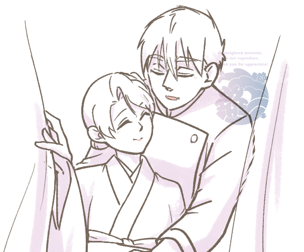 一緒にいると常に距離が近い感じがする二人なんですけど、隙あらばキスしてハグしてイチャイチャしててほしい~~~~! という絵が2枚あります。時系列はバラバラ。二人ともいい大人で品のある振る舞いをするので、人目のある所ではやらないでしょうけど、人の見てないところで熱烈な感じになってるとわたくしが楽しいので……存分にいちゃついてほしい……。
